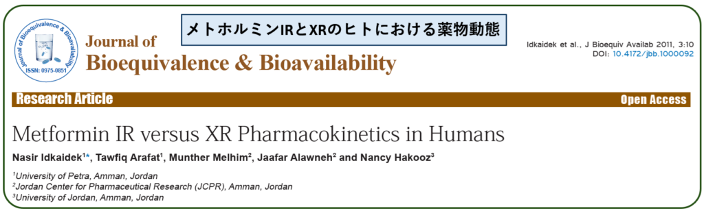 18歳から50歳までのヨルダン人男性78人(BMI= 17.1~28.6) の測定結果です.ヨルダンでは肥満の人は少ないようですね. 即放性IRメトホルミンの方が徐放性XRメトホルミンよりも血中濃度が高いですが,これは即放性IRは1,000mg/錠,徐放性XRは750mg/錠しか市販品がなかったためです.