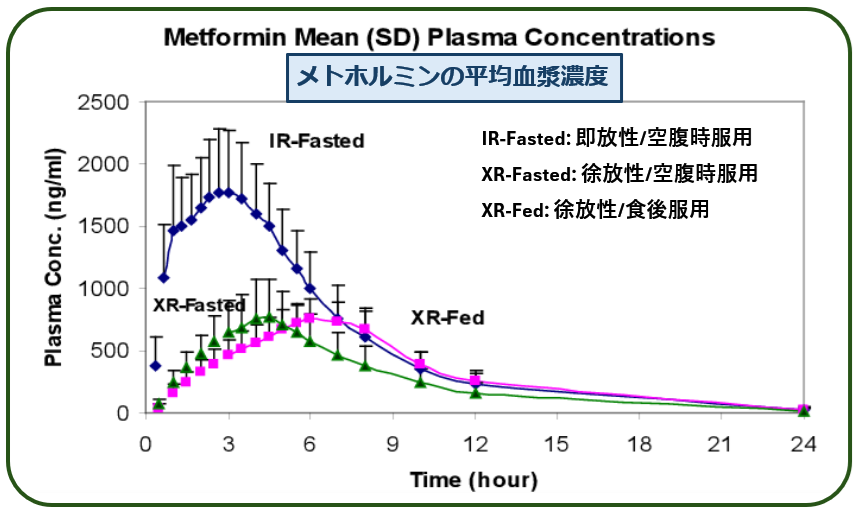 当然ですが,徐放性XRメトホルミンは,即放性IRよりも 緩やかに血中濃度が上昇/下降し,ピークは服用後4-6時間と,即放性IRの倍以上遅くなっています. さらに 徐放性XRを食後に服用するとピーク時刻が更に遅れています.